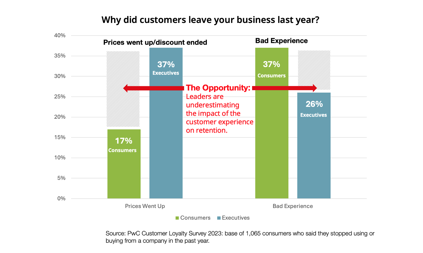 While that might seem logical, PwC’s 2023 Consumer Loyalty Survey reveals that leaders are underestimating the impact of the customer experience on retention. The results show that only 26% of executives cite customer experience as the top reason customers leave—yet 37% of customers say they leave due to a poor product or service experience. 2 This points to a significant misalignment, and an opportunity.
