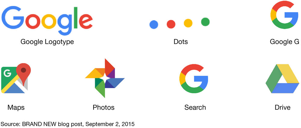 If we look at Google’s recent redesign, the logo is only one part of its overall identity. As you can see from the images below — color, flat graphic styling and geometric shapes play an important role in connecting users with the Google brand experience, no matter what path of interaction they take, or how small the icon.